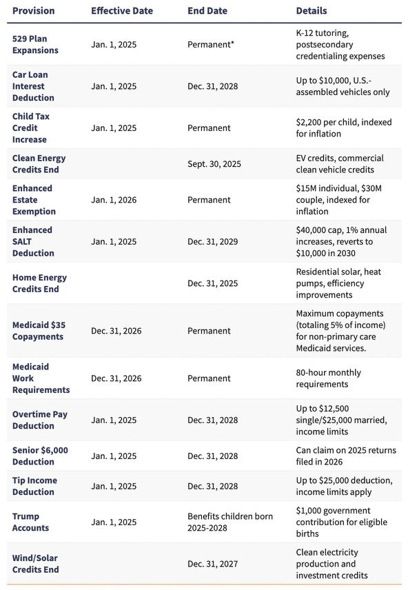 We're entering the critical year-end financial planning season—a time to review goals, adjust strategies, and generally strengthen your financial health. With this in mind, we're sharing this table of important start and end dates related to tax credits, exemptions and other financial transactions in the One Big Beautiful Bill Act (OBBBA). Some of the OBBA's provisions are permanent and others are time-limited, so we recommend proactive planning to take advantage of the ones that apply to you while you can.